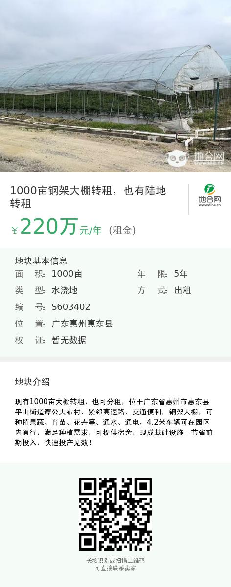 现有1000亩大棚转租,也可分租,位于广东省惠州市惠东县平山街道谭公大布村,紧邻高速路,交通便利,钢架大棚,可种植果蔬、育苗、花卉等、通水、通电,4.2米车辆可在园区内通行,满足种植需求,可提供宿舍,现成基础设施,节省前期投入,快速投产见效!